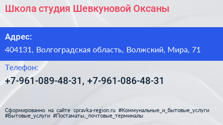 Школа-студия Шевкуновой Оксаны по адресу 404131, Волгоградская область, Волжский, Мира, 71 в дальнейшем Организация, размещена в следующих категориях: