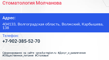 Стоматология Молчанова по адресу 404133, Волгоградская область, Волжский, Карбышева, 138 в дальнейшем Организация, размещена в следующих категориях: