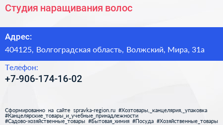 Студия наращивания волос по адресу 404125, Волгоградская область, Волжский, Мира, 31а в дальнейшем Организация, размещена в следующих категориях: