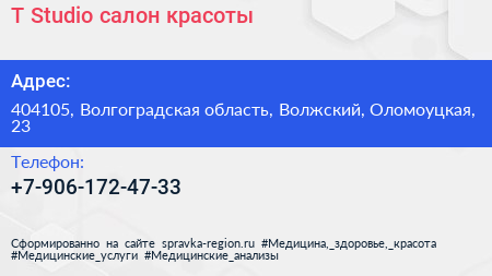 T-Studio, салон красоты по адресу 404105, Волгоградская область, Волжский, Оломоуцкая, 23 в дальнейшем Организация, размещена в следующих категориях: