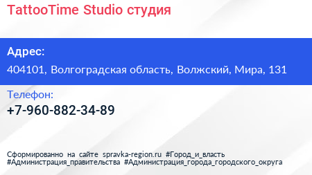 TattooTime Studio, студия по адресу 404101, Волгоградская область, Волжский, Мира, 131 в дальнейшем Организация, размещена в следующих категориях: