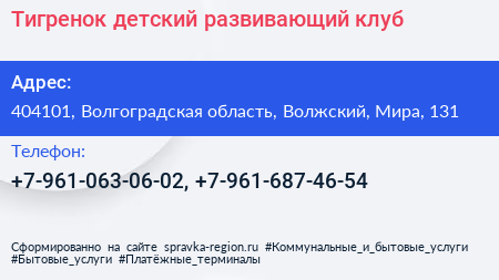 Тигренок, детский развивающий клуб по адресу 404101, Волгоградская область, Волжский, Мира, 131 в дальнейшем Организация, размещена в следующих категориях: