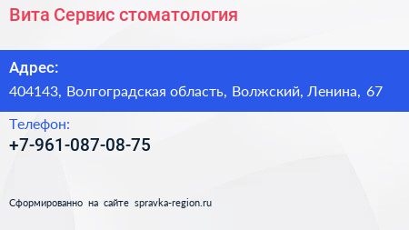 Вита-Сервис, стоматология по адресу 404143, Волгоградская область, Волжский, Ленина, 67 в дальнейшем Организация, размещена в следующих категориях: