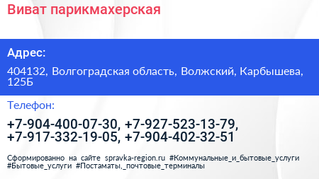 Виват, парикмахерская по адресу 404132, Волгоградская область, Волжский, Карбышева, 125Б в дальнейшем Организация, размещена в следующих категориях: