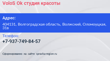 VoloS`Ok, студия красоты по адресу 404131, Волгоградская область, Волжский, Оломоуцкая, 31в в дальнейшем Организация, размещена в следующих категориях: