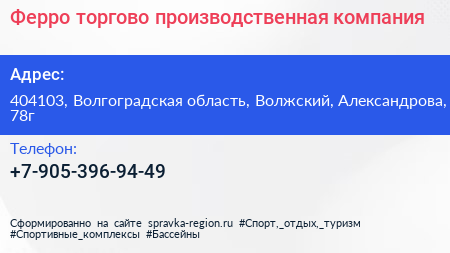 Ферро, торгово-производственная компания по адресу 404103, Волгоградская область, Волжский, Александрова, 78г в дальнейшем Организация, размещена в следующих категориях:
