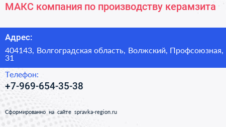 МАКС, компания по производству керамзита по адресу 404143, Волгоградская область, Волжский, Профсоюзная, 31 в дальнейшем Организация, размещена в следующих категориях: