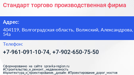 Стандарт, торгово-производственная фирма по адресу 404119, Волгоградская область, Волжский, Александрова, 54а в дальнейшем Организация, размещена в следующих категориях: