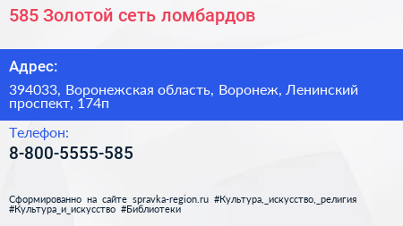 585*Золотой, сеть ломбардов по адресу 394033, Воронежская область, Воронеж, Ленинский проспект, 174п в дальнейшем Организация, размещена в следующих категориях: