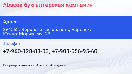 Abacus, бухгалтерская компания по адресу 394062, Воронежская область, Воронеж, Южно-Моравская, 28 в дальнейшем Организация, размещена в следующих категориях:
