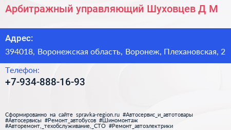 Арбитражный управляющий Шуховцев Д.М. по адресу 394018, Воронежская область, Воронеж, Плехановская, 2 в дальнейшем Организация, размещена в следующих категориях: