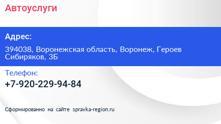 Автоуслуги по адресу 394038, Воронежская область, Воронеж, Героев Сибиряков, 3Б в дальнейшем Организация, размещена в следующих категориях: