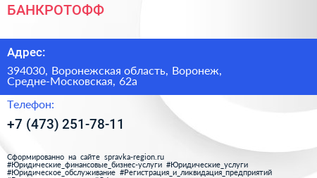 БАНКРОТОФФ по адресу 394030, Воронежская область, Воронеж, Средне-Московская, 62а в дальнейшем Организация, размещена в следующих категориях: