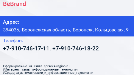 BeBrand по адресу 394036, Воронежская область, Воронеж, Кольцовская, 9 в дальнейшем Организация, размещена в следующих категориях: