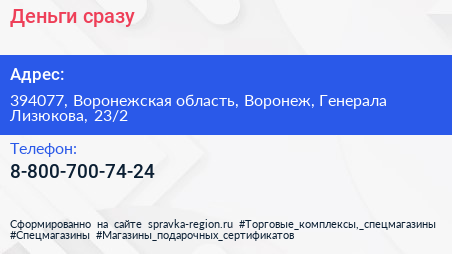 Деньги сразу по адресу 394077, Воронежская область, Воронеж, Генерала Лизюкова, 23/2 в дальнейшем Организация, размещена в следующих категориях: