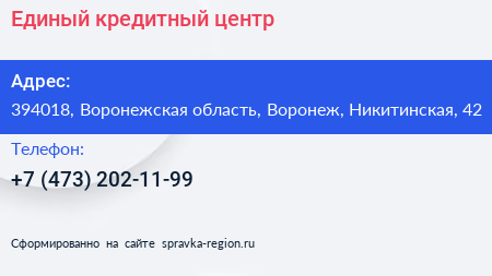 Единый кредитный центр по адресу 394018, Воронежская область, Воронеж, Никитинская, 42 в дальнейшем Организация, размещена в следующих категориях: