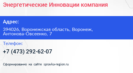 Энергетические Инновации, компания по адресу 394026, Воронежская область, Воронеж, Антонова-Овсеенко, 7 в дальнейшем Организация, размещена в следующих категориях: