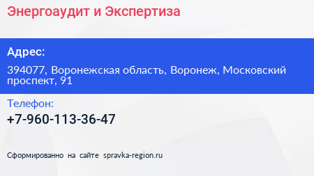 Энергоаудит и Экспертиза по адресу 394077, Воронежская область, Воронеж, Московский проспект, 91 в дальнейшем Организация, размещена в следующих категориях: