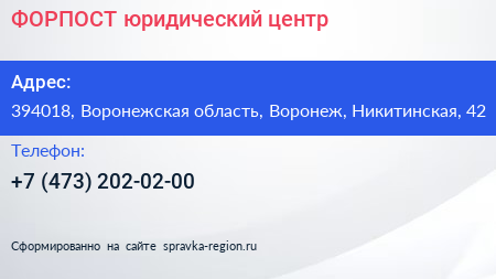 ФОРПОСТ, юридический центр по адресу 394018, Воронежская область, Воронеж, Никитинская, 42 в дальнейшем Организация, размещена в следующих категориях: