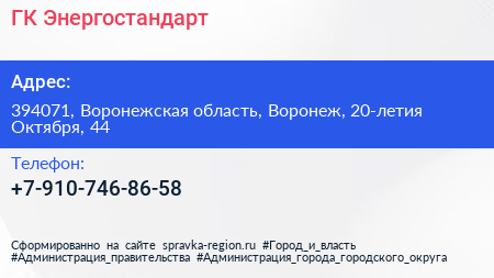 ГК Энергостандарт по адресу 394071, Воронежская область, Воронеж, 20-летия Октября, 44 в дальнейшем Организация, размещена в следующих категориях: