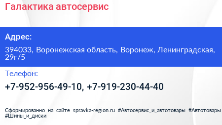 Галактика, автосервис по адресу 394033, Воронежская область, Воронеж, Ленинградская, 29г/5 в дальнейшем Организация, размещена в следующих категориях: