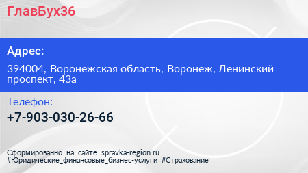 ГлавБух36 по адресу 394004, Воронежская область, Воронеж, Ленинский проспект, 43а в дальнейшем Организация, размещена в следующих категориях: