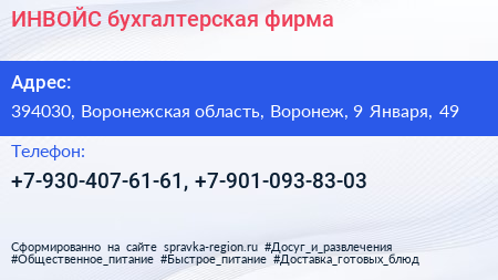 ИНВОЙС, бухгалтерская фирма по адресу 394030, Воронежская область, Воронеж, 9 Января, 49 в дальнейшем Организация, размещена в следующих категориях: