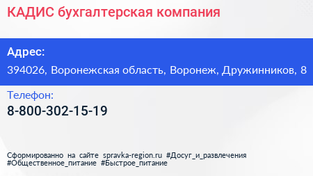 КАДИС, бухгалтерская компания по адресу 394026, Воронежская область, Воронеж, Дружинников, 8 в дальнейшем Организация, размещена в следующих категориях:
