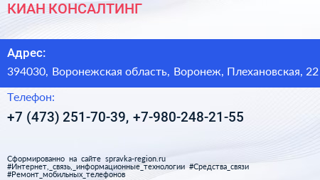 КИАН КОНСАЛТИНГ по адресу 394030, Воронежская область, Воронеж, Плехановская, 22 в дальнейшем Организация, размещена в следующих категориях: