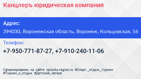 Канцлеръ, юридическая компания по адресу 394030, Воронежская область, Воронеж, Кольцовская, 56 в дальнейшем Организация, размещена в следующих категориях: