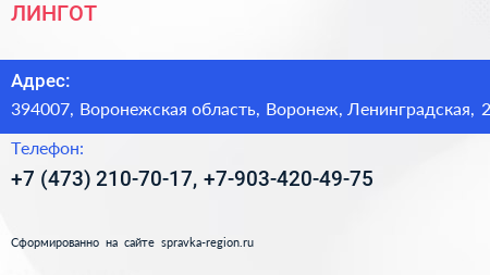 ЛИНГОТ по адресу 394007, Воронежская область, Воронеж, Ленинградская, 2 в дальнейшем Организация, размещена в следующих категориях: