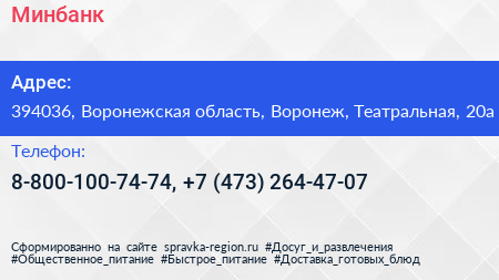 Минбанк по адресу 394036, Воронежская область, Воронеж, Театральная, 20а в дальнейшем Организация, размещена в следующих категориях: