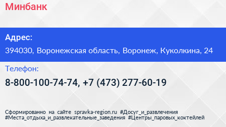Минбанк по адресу 394030, Воронежская область, Воронеж, Куколкина, 24 в дальнейшем Организация, размещена в следующих категориях: