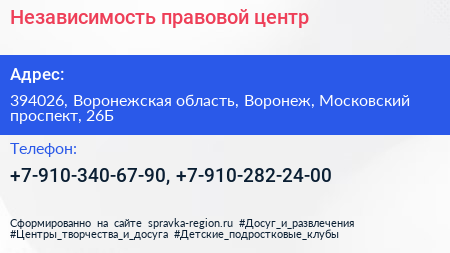 Независимость, правовой центр по адресу 394026, Воронежская область, Воронеж, Московский проспект, 26Б в дальнейшем Организация, размещена в следующих категориях: