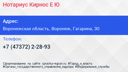 Нотариус Кирнос Е.Ю. по адресу Воронежская область, Воронеж, Гагарина, 30 в дальнейшем Организация, размещена в следующих категориях: