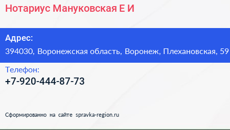 Нотариус Мануковская Е.И. по адресу 394030, Воронежская область, Воронеж, Плехановская, 59 в дальнейшем Организация, размещена в следующих категориях: