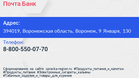 Почта Банк по адресу 394019, Воронежская область, Воронеж, 9 Января, 130 в дальнейшем Организация, размещена в следующих категориях:
