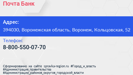 Почта Банк по адресу 394030, Воронежская область, Воронеж, Кольцовская, 52 в дальнейшем Организация, размещена в следующих категориях:
