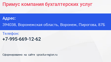 Примус, компания бухгалтерских услуг по адресу 394038, Воронежская область, Воронеж, Пирогова, 87Б в дальнейшем Организация, размещена в следующих категориях: