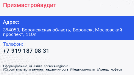 Призмастройаудит по адресу 394053, Воронежская область, Воронеж, Московский проспект, 110л в дальнейшем Организация, размещена в следующих категориях: