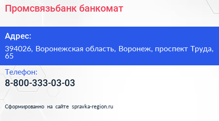Промсвязьбанк, банкомат по адресу 394026, Воронежская область, Воронеж, проспект Труда, 65 в дальнейшем Организация, размещена в следующих категориях:
