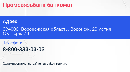 Промсвязьбанк, банкомат по адресу 394006, Воронежская область, Воронеж, 20-летия Октября, 78 в дальнейшем Организация, размещена в следующих категориях: