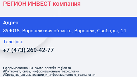 РЕГИОН-ИНВЕСТ, компания по адресу 394018, Воронежская область, Воронеж, Свободы, 14 в дальнейшем Организация, размещена в следующих категориях: