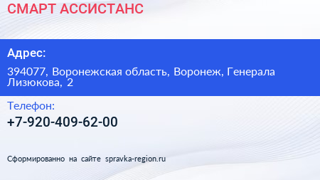 СМАРТ АССИСТАНС по адресу 394077, Воронежская область, Воронеж, Генерала Лизюкова, 2 в дальнейшем Организация, размещена в следующих категориях: