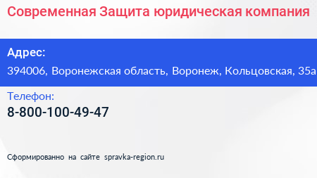Современная Защита, юридическая компания по адресу 394006, Воронежская область, Воронеж, Кольцовская, 35а в дальнейшем Организация, размещена в следующих категориях:
