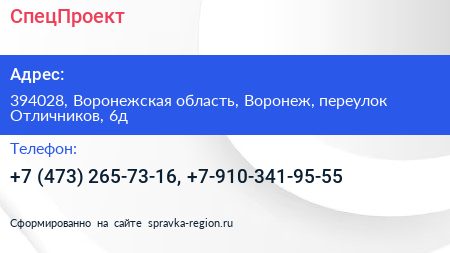 СпецПроект по адресу 394028, Воронежская область, Воронеж, переулок Отличников, 6д в дальнейшем Организация, размещена в следующих категориях: