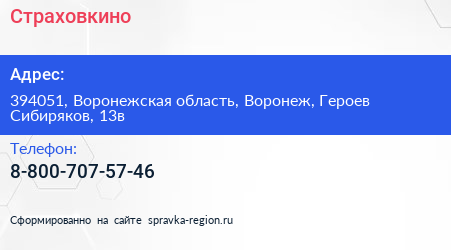 Страховкино по адресу 394051, Воронежская область, Воронеж, Героев Сибиряков, 13в в дальнейшем Организация, размещена в следующих категориях: