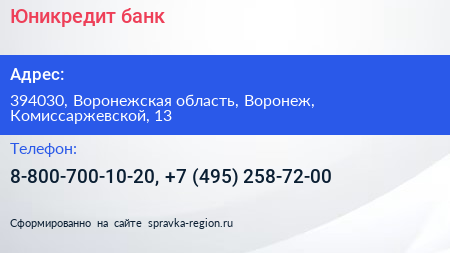 Юникредит банк по адресу 394030, Воронежская область, Воронеж, Комиссаржевской, 13 в дальнейшем Организация, размещена в следующих категориях: