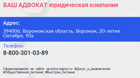ВАШ АДВОКАТ, юридическая компания по адресу 394006, Воронежская область, Воронеж, 20-летия Октября, 90а в дальнейшем Организация, размещена в следующих категориях: