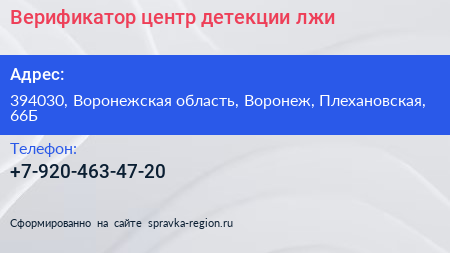 Верификатор, центр детекции лжи по адресу 394030, Воронежская область, Воронеж, Плехановская, 66Б в дальнейшем Организация, размещена в следующих категориях: